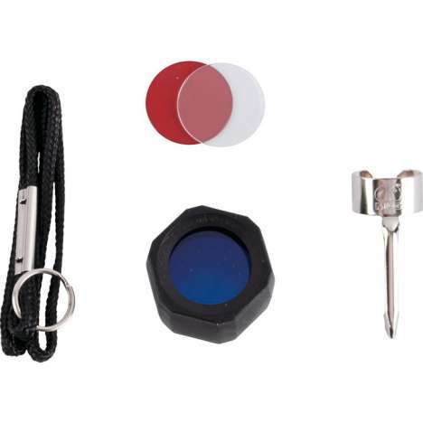 Accessory pack for the Mini Maglite AA flashlights, includes a Red, Amber & Clear Lenses, Anti-roll device/lens holder, Wrist Lanyard, Pocket Clip.