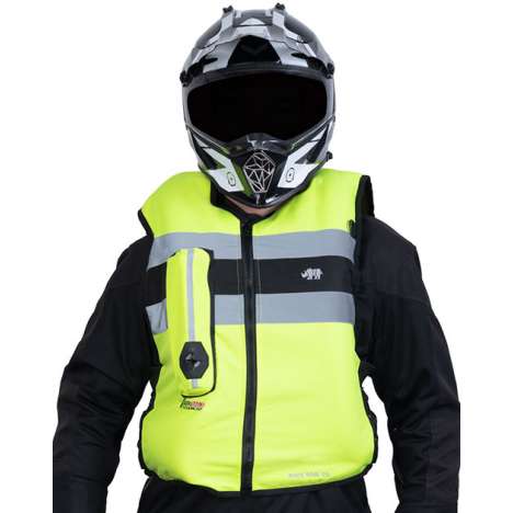 Mirage Airbag Vest, bij een ongeval en eenmaal opgeblazen, beschermt tegen stoten, stoten en ook tegen slijtage.